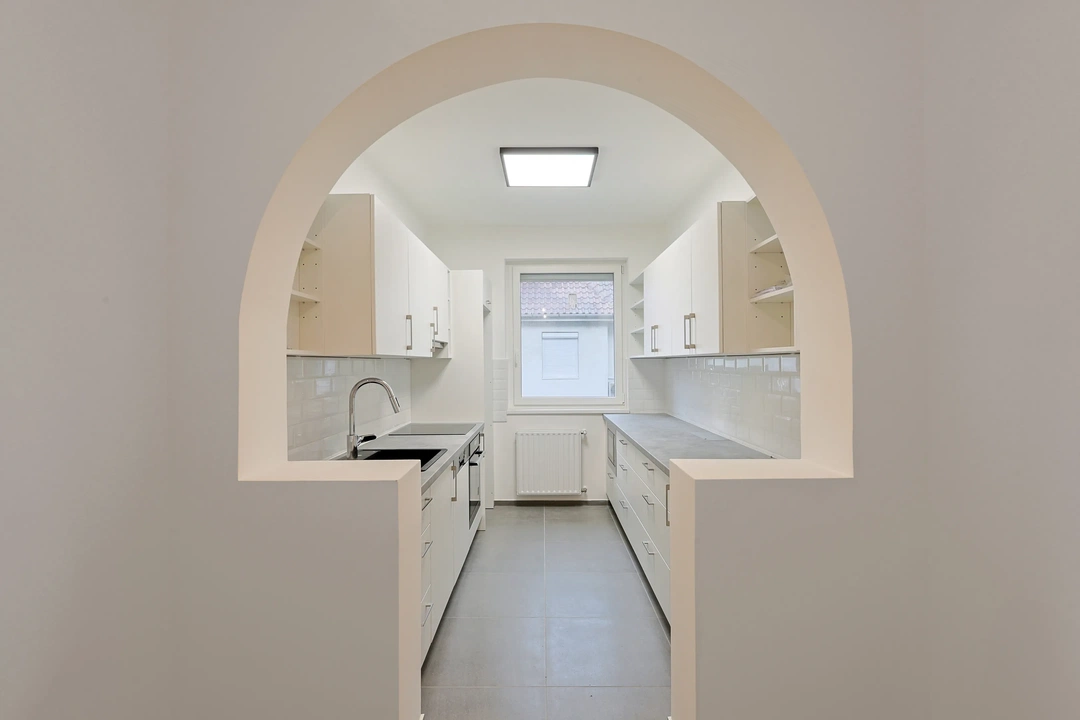 Ebben a budapesti, 92 m²-es, 3 szobás lakásban tökéletesen kialakított kisebb méretű, új gépekkel felszerelt konyhát találunk. Bőven akad konyhapult a főzési előkészületekre és a fehér bútorok még inkább növelik a térérzésünket.