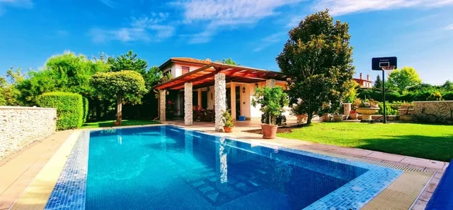 A több mint 900 négyzetméteres, gondosan kialakított kertben leanderek, pálmák, tuják, cserjék burjánzanak. Éppen ezért a két autónak is fedezékül szolgáló garázst a kert alá tervezték. A kert teljesen a család kényelmét szolgálja, legalábbis erről árulkodik a feszített víztükrű medence és a kőből épült kerti sütögető is. Laknád?