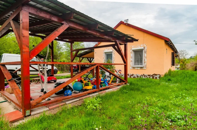 Egy kisebb kert is jár hozzá, és bár a hirdetés nem tartalmazza, a képek alapján a fűtéshez sem nekünk kell vágni a fát.