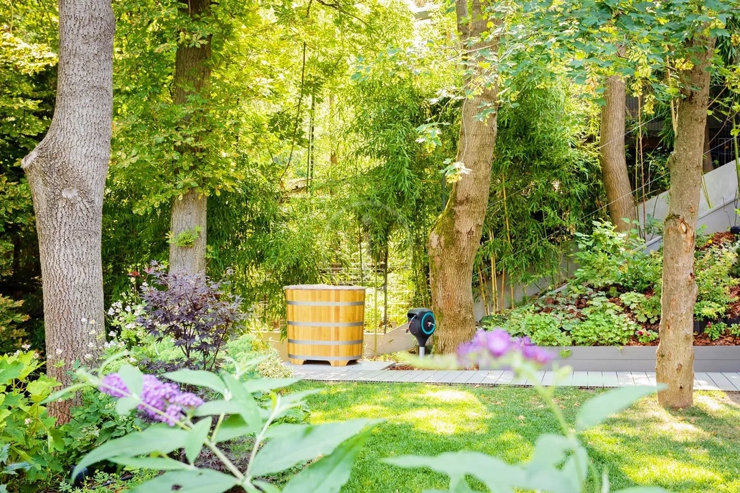 A 608 négyzetméteres saját telek plusz a 194 négyzetméteres közös használatú terület elegendő teret biztosít. A telepített gyepet robotfűnyíró tartja karban, így a kert szépsége fenntartható anélkül, hogy minden hétvégét a fűnyírással töltenél.