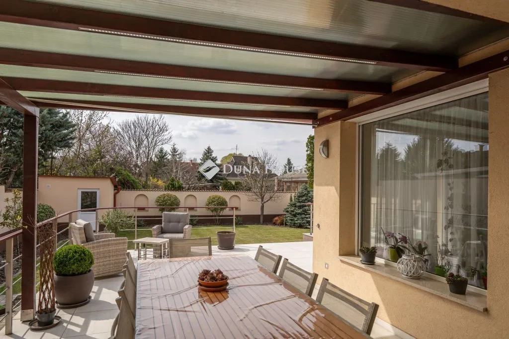 A 473 négyzetméteres telek növényeit, illetve nagyrészt füves területét automata öntözőrendszer gondozza. A kertre néző terasz fedetlen részén található a beépített jakuzzi, míg a fedett részen a kinti étkezőgarnitúra.