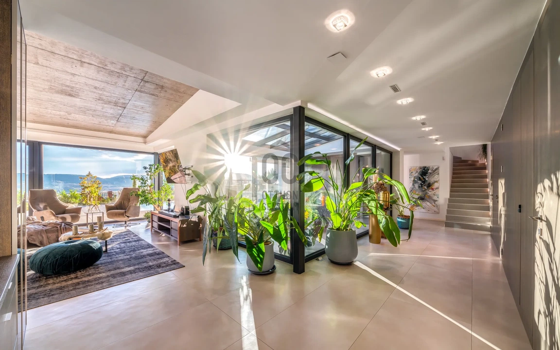 A villa medencével és tágas terasszal rendelkezik, ahonnan csodálatos kilátás nyílik a környékre. A házba belépve a tágasság érzése azonnal magával ragad. A nagy üvegfelületeknek köszönhetően a kert és a nappali szinte egyetlen térként fonódik össze. A beton mennyezet erős karaktert ad, a meleg árnyalatú padló és puha textíliák pedig barátságos ellenpontot teremtenek.