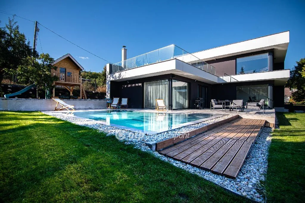 A következő, 2020-ban épült, hat szobás, 245 négyzetméteres passzív családi ház Balatonalmádiban található, örökpanorámával a Balatonra. Az emeleten egy hatalmas tetőteraszról élvezhetjük a balatoni kilátást. Az ingatlan teljesen automatizált okosotthon rendszerrel van felszerelve, amely távolról is vezérelhető. Az épület hőhídmentes szerkezettel és kiváló hőszigeteléssel rendelkezik. A ház gépészete központi klímát, porszívót, szellőztető rendszert, villany padlófűtést és hőszivattyús bojlert tartalmaz.
