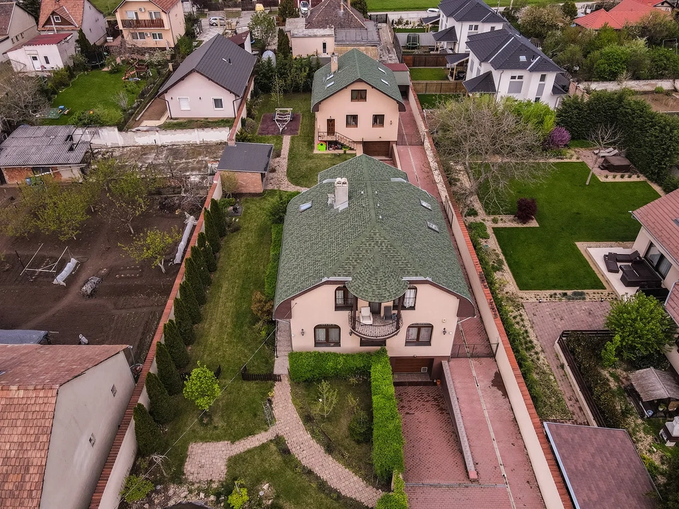 Fót egyik csendes zsákutcájában, egy 1510 négyzetméteres telken két három szintes házat hirdetnek. Az első épület, 280 négyzetméteres, amiben tágas nappali, gépesített konyha, hálószoba, valamint egy kertre néző terasz jelenti a vonzerőt, emellett a felső szinten négy szoba és két erkély található. A második ház 200 négyzetméteres, hasonló elosztású, nagy nappalival, két szobával és terasszal.