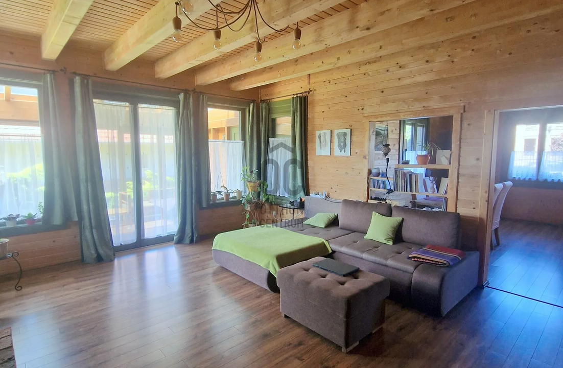 A házban található összes nyílászáró hét éve újult meg, a német Remmers felületkezelt lucfenyőből készült ablakok olíva zöld színükkel harmonikusan illeszkednek a természeti környezetbe. Ráadásul redőnnyel és szúnyoghálóval felszereltek. Az egyedi konyhabútor és a terasz kőrisfából készült.