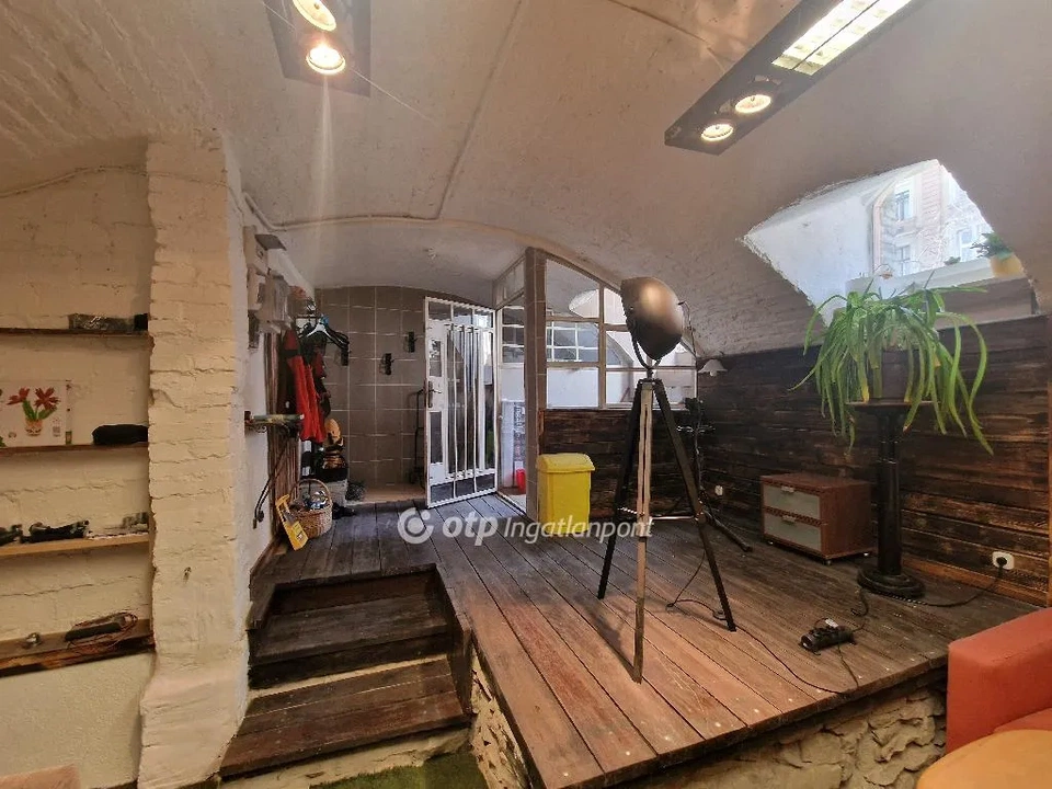 Ez a 60 négyzetméteres lakás korábban üzlethelyiség volt, így az utcáról megközelíthető. Úgy tudsz bemenni, hogy néhány lépcsőfokot lesétálsz, ahol egy tágas előtérbe jutsz, amely kis szintkülönbséggel csatlakozik a nagyobb térhez. Az egybefüggő alapterület egyszerre nappali, előtér és közlekedő, a fehérre meszelt dongaboltozat és a fenyődeszkás emelt padló pedig karaktert ad a térnek. A falat részben rusztikus, barna palló borítja. A nagy belmagasság miatt a térérzet valóban nem szokványos egy ilyen elhelyezkedésű ingatlannál.