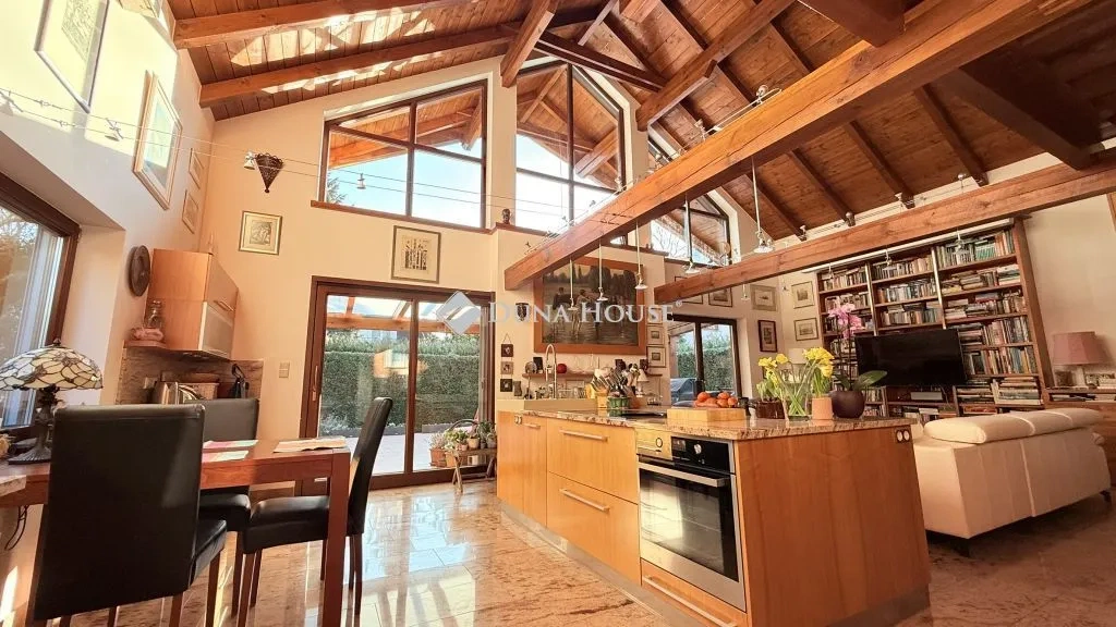 Az otthon lelke a nagy belmagasságú, teljesen benapozott nappali, amelyet a beáradó természetes fény meleg, bensőséges hangulattal tölt meg. Innen nyílik a 79 négyzetméteres terasz, amelynek közel fele fedett és elektromos zsaluziákkal felszerelt. Ennek a megoldásnak köszönhető, hogy a nyár legforróbb délutánján is élhető marad. A kétrétegű, edzett üvegtető motoros árnyékolóval pedig tovább finomítja a komfortérzetet - fényt enged be, de nem engedi túlmelegedni a helyiséget.