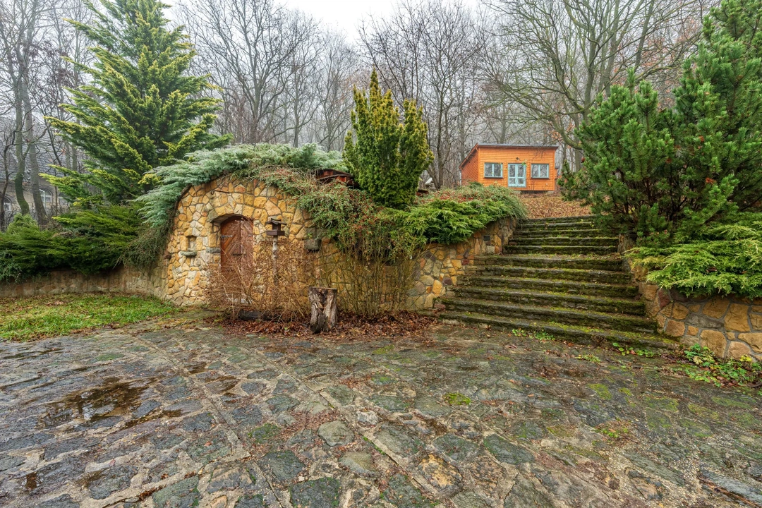 Az ingatlan alapját a két külön helyrajzi számon lévő, összesen 1974 négyzetméteres terület jelenti, ami nemcsak a mérete miatt különleges, hanem mert közvetlen kapuja van az állami erdőre, így a kert gyakorlatilag a Pilisben folytatódik. A telken automata öntözőrendszer segít a karbantartásban, ami egy ekkora zöldfelületnél már nélkülözhetetlen segítség.