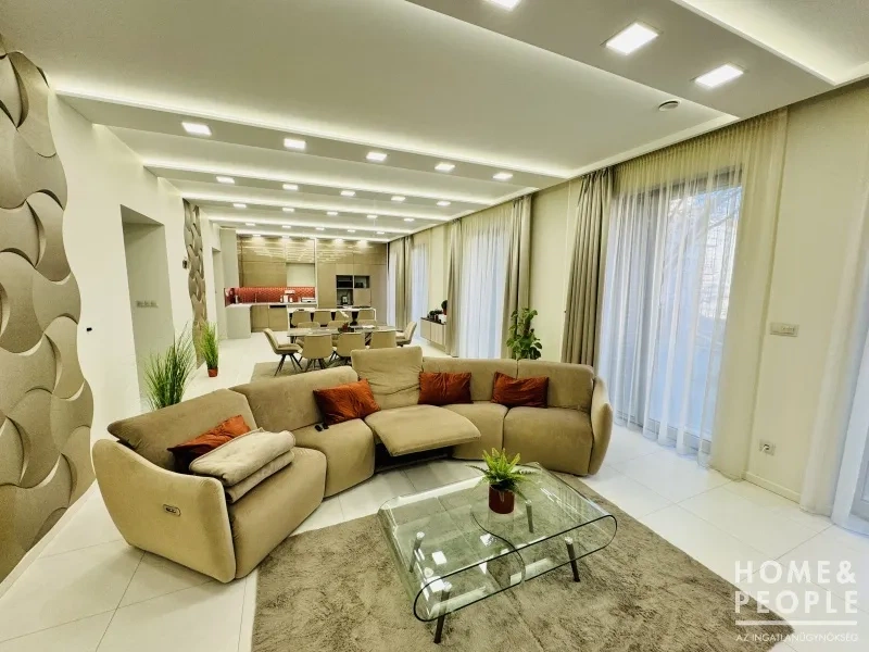 Átlagosnak nem mondható, modern stílusú nappali, visszafogott és letisztult enteriőrrel, a fali panelek harmonizálnak a kanapé és a függönyök színével.