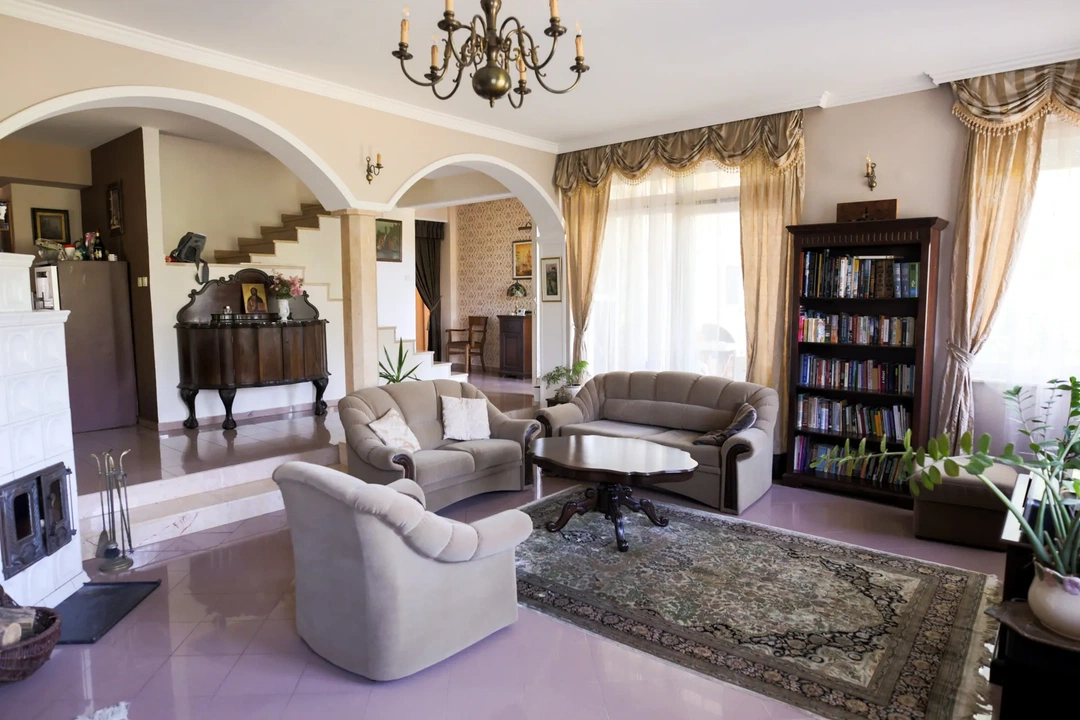 A kúria leghangsúlyosabb része a nappali, ami a berendezéseivel, burkolataival tökéletesen megvalósítja a neobarokk enteriőrt. A rokokó jegyeit viselő ülőgarnitúra vonzza a tekintetet. Egyrészt azért, mert a tér közepén foglal helyet, másrészt a díszítettsége abszolút ellentétben áll a mostani letisztult, minimalizmusba hajló trendekkel.