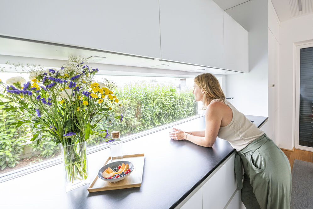 A keskeny keret és a nagy üvegfelület tehát több természetes fénnyel jár, miközben letisztult és modern megjelenést biztosít, ami nagyon egyszerűvé és időtlenné teszi a nyílászárót. A belső oldalon a keret különösen keskeny és síkban fut az ablakszárnnyal.