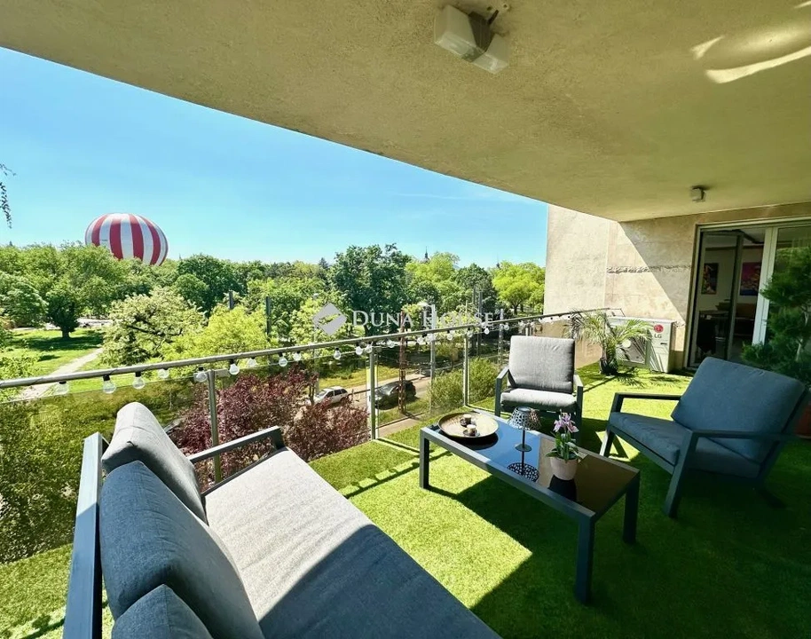 A teraszon antracit színű kerti garnitúra áll, amit trópusi szobanövények vesznek körbe és ahonnan rálátni a Városliget legnépszerűbb jelképére, a hőlégballonra.