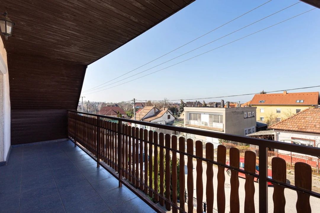 Egy kétlakásos házban található ez a belső kétszintes (61+55 négyzetméteres), 3+2 félszobás téglalakás a kertváros egyik csendes környékén. Az ingatlan 1991-ben épült, mindkét szinthez nagyméretű erkély tartozik, az alagsorban egy üzlethelyiség található. Két autó tárolására alkalmas gépkocsibeállót is építettek hozzá.