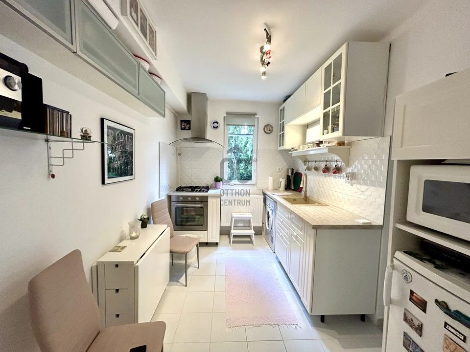 Az ingatlant 2018-ban teljesen felújították. A fűtésről és melegvízről gázkazán gondoskodik, illetve a nappalin keresztül a lakás klimatizált. Az előszobában egy hatalmas beépített szekrény könnyíti meg a tárolást. A hasonló méretű lakásokhoz képest nagyméretűnek számít a konyha-étkező és a fürdőszoba is kényelmesen tágas. A hangulatos látvány kandallóval felszerelt nappaliból nyílik egy kisebb és egy nagyobb hálószoba.