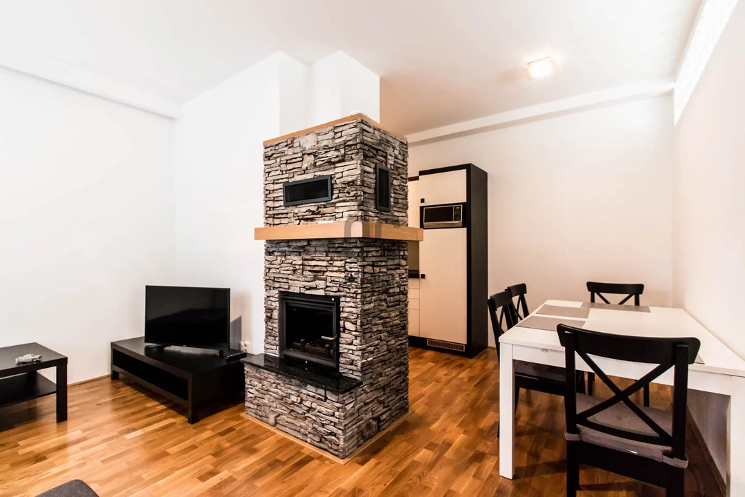 Pár perc séta az Oktogon vagy a Westend, de a lakásba lépve a kandalló köré rendezett étkezős konyha és a tágas nappali azonnal elfeledteti a külvilágot. Ebből is látszik, hogy a kandalló nem csak egy díszlet, hanem a funkcionális lakótér szíve, amely összeköti a modern technológiát a hagyományos otthoni békével.