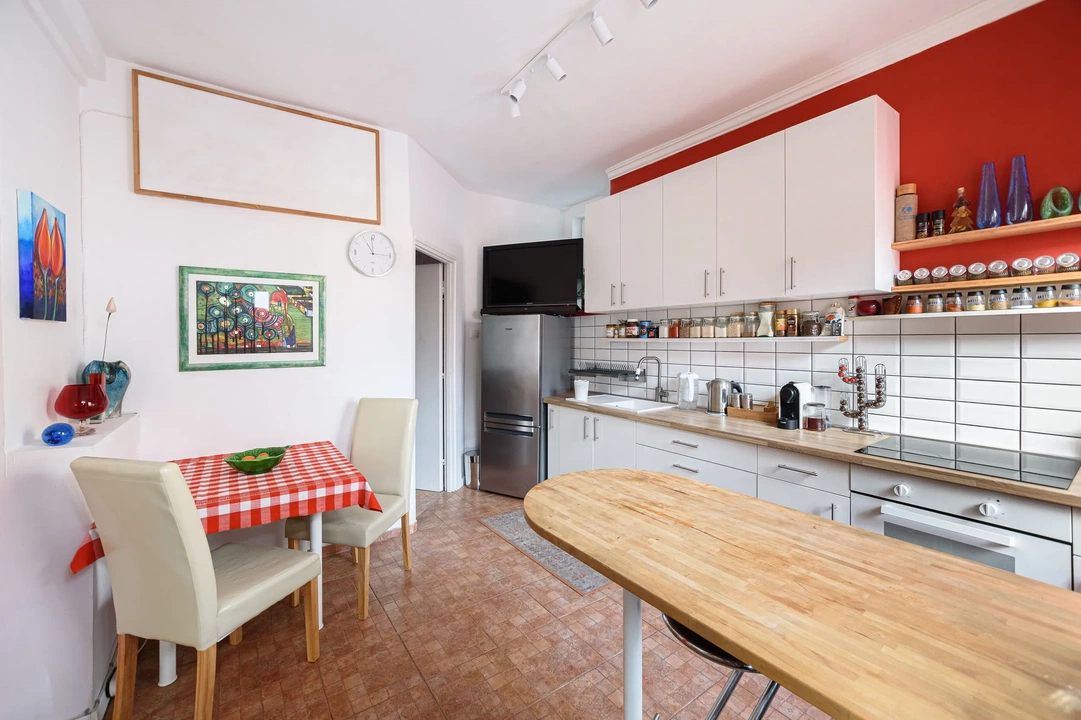 Kifinomultan van jelen a piros szín nem csak a konyhában, hanem a lakás többi részén is.