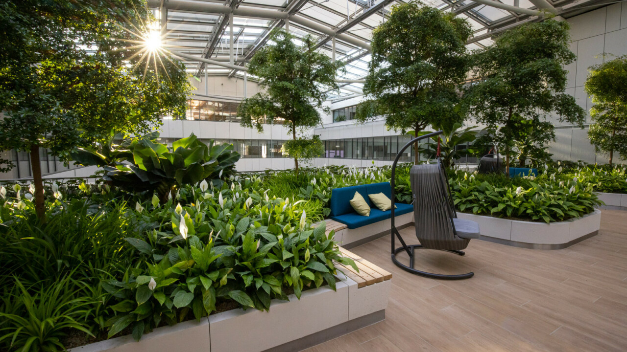 Az irodaház különlegessége nem is az irodarész, hanem a közös belső terek és a kertek kialakítása, amelyeket a természetközeliség, emberközpontúság, a biofília szavakkal írják körül. Az irodaházba érkező munkatársak és vendégek nagy fákkal, pavilonokkal, éttermi teraszokkal kialakított parkon keresztül juthatnak be az épületbe. A belső udvarok, a tetőteraszok is burjánzó növényekkel, 5-6 méteres fákkal vannak betelepítve.