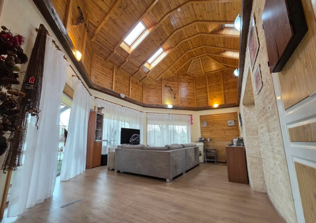 A képeken is látható szaunakabin és a mellette elhelyezett jakuzzi a ház egy intimebb, fával burkolt szegletében kapott helyet, közvetlen természetes bevilágítással. A gépészet a kettősségre épít: a gázfűtés mellett egy vegyestüzelésű kazán is rendelkezésre áll, a jövőbiztos működést pedig a már előkészített napelemrendszer csatlakozási lehetősége biztosítja. A nyári hőterhelést klímaberendezés ellensúlyozza, az udvari növényzet gondozását pedig saját fúrt kút teszi költséghatékonyabbá.