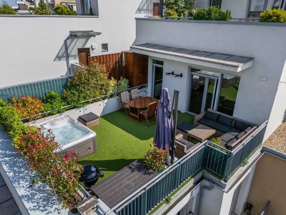 A harmonikus belső teret a nyitott konyha-étkező-nappali triumvirátus alapozza meg, de a további három napfényes hálószoba, két zuhanyzós fürdőszoba, külön mosókonyha és két praktikus gardrób is tökéletesen beleillik. Igazi különlegesség a 65 négyzetméteres terasz, amely ideális helyszíne lehet baráti összejöveteleknek.