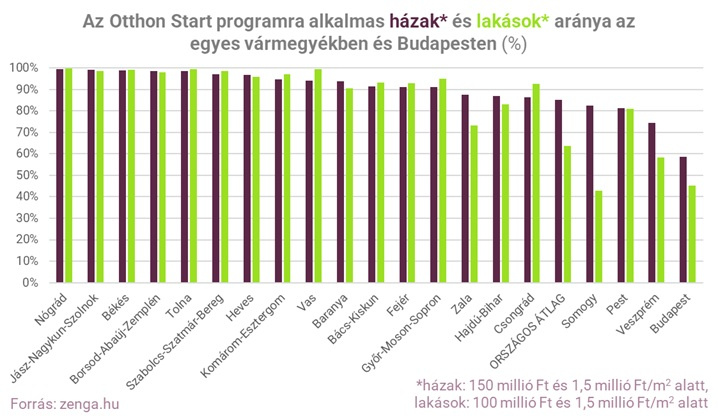 A zenga.hu hirdetési portál kínálata szerint az Otthon Start program feltételeinek a vármegyékben található lakóingatlanok legalább 80 százaléka megfelel. A lakások esetében Budapesten kívül három olyan vármegye van, ahol a támogatható kínálat nem éri el a 80 százalékot, azaz a négyzetméterárak nagyobb arányban haladják meg az 1,5 millió forintot, a vételár pedig a 100 vagy 150 millió forintot.