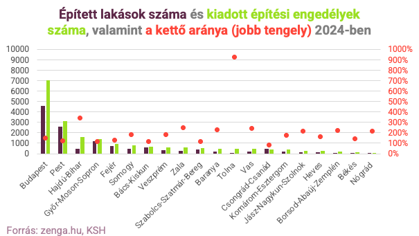 “Ha idén még nem is, de jövőre több lakóingatlan épülhet meg. Erre utal, hogy az idei első negyedévben átadott lakások száma 3 százalékkal elmarad ugyan a tavalyi év azonos időszakában mértnél, de az építési engedélyek számában már 25 százalékos erősödést látunk. Noha jellemzően kevesebb lakást adnak át általában, mint amennyi a kiadott építési engedélyek száma, így is pozitívabb jövőt mutat, hogy egy kivételével minden vármegyében több építkezést terveznek, mint amennyi 2024-ben megvalósult” - mondta a zenga.hu elemzési vezetője. (Lásd: borítókép)