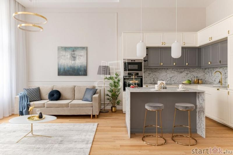 Az V. kerületben, 101 négyzetméteres, 3 szobás, tágas lakás keresi új tulajdonosát. A hálószobák mindegyikéhez saját fürdőszoba tartozik, mely tovább emeli a luxus életérzést. A legdrágább kerületben nem szokatlan a fényűző enteriőr, de ebben az ingatlanban a bútorok, a burkolatok, a színek tökéletes összhangba kerültek egymással. Pár perces sétatávra könnyen elérhetőek a város elegáns negyedei, híres terei és a Duna-part, mely pazar kikapcsolódási, feltöltődési lehetőségeket rejt magában.