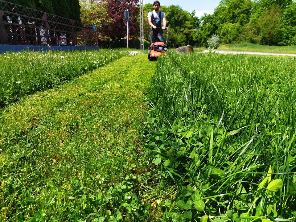 - Ipari, benzinmotoros fűnyíróink vannak és nemrég szereztük be a fűnyíró traktort. Külön gépet használunk a pázsiton, és egy másikkal vágjuk a füvet. A derékig, vagy még magasabb gazos területeken pedig bevetjük a fűkaszát és a traktort. Nemrég olyan helyre hívtak minket, ahol magasabb volt a növényzet, mint én, ráadásul csalánról volt szó. A gyep karbantartására is megvannak a megfelelő eszközeik, így ha kell, profi módon tudják a gyepszellőztetést kivitelezni.