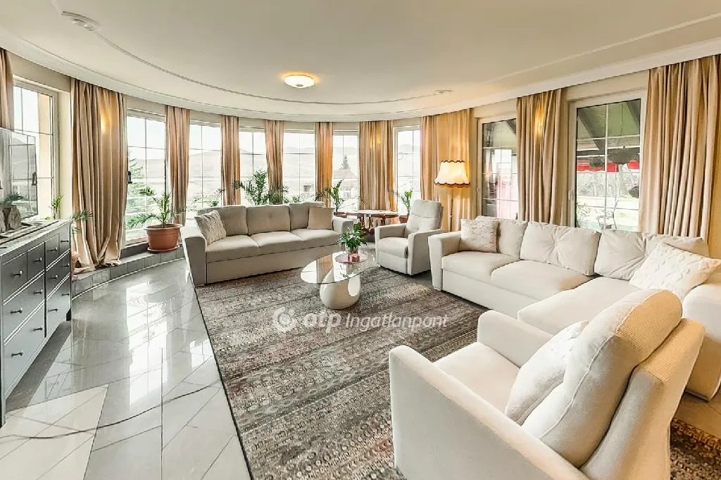 Az első emelet nappalija a ház legikonikusabb tere. Rendhagyó a félköríves alaprajza, valamint a tíz ablak és a négy teraszajtó, ami elképesztő fénymennyiséget enged be a monumentális helyiségbe. A márványgránit burkolat és a kandalló toszkán villák légkörét idézi, amihez a modern fekete konyha és étkezőblokk pontosan a kellő ellenpontot adja: nem oldja fel, hanem élesíti ezt az eleganciát.