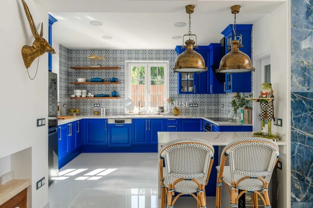 A vízparti oldalon áll az újépítésű, egyedi tervek szerint készült, közel 200 négyzetméteres családi ház. A ház központi tere a közel ötven négyzetméteres, ötméteres belmagasságú nappali, és egy 45 négyzetméteres télikert, amely nyáron összenyitható a kerttel. A konyha óceánparti hangulatú tervezésű, de az egész ingatlanra jellemző a luxus kivitelezés, amit az is alátámaszt, hogy a tulajdonosok a berendezési tárgyak nagy részét az USA-ban egyedileg gyártatták, illetve vásárolták.