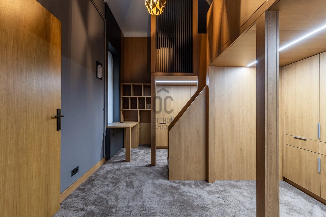 A lakás 3,6 méteres belmagassága adta az alapot ennek a több hálószobás, egyedi kialakítású otthonnak. Az ingatlan központi eleme a faburkolat, ami a falakon, a beépített bútorokban és a részletekben is visszaköszön.
