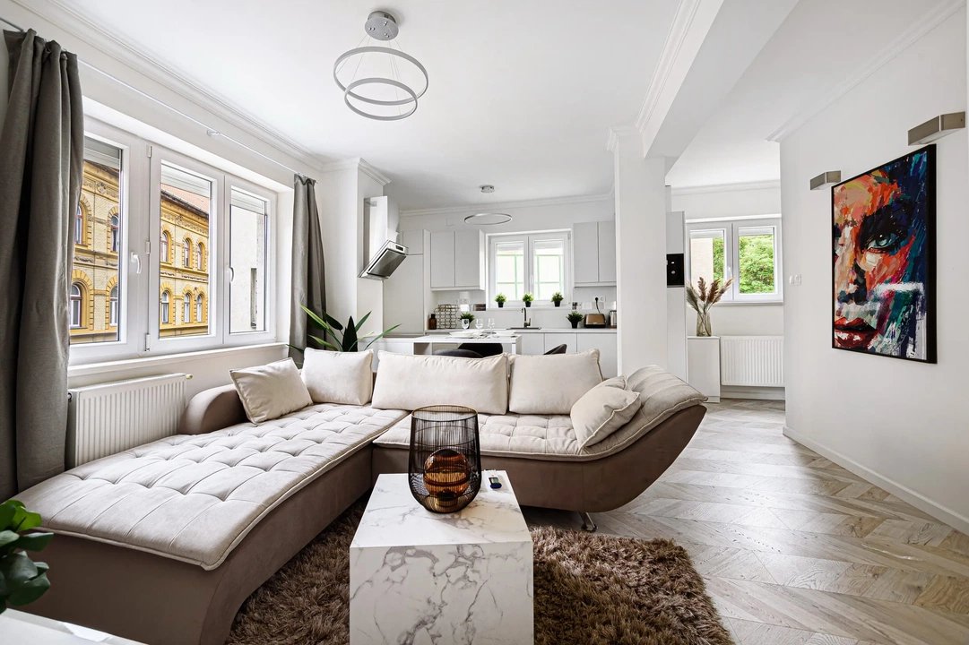 Ennek a budapesti belvárosi lakásnak nem feltétlenül lenne szüksége optikai méretnövelésre. Hatalmas belmagassággal, és a felújításnak köszönhetően nagy, világos terekkel rendelkezik. Mégis, domináns színnek a tulajdonos a fehér színt választotta. És milyen jól tette! Ezzel visszaadta a nagypolgári lakás végtelen eleganciáját, amit még a modern amerikai konyhás kialakítás sem tud megtörni.