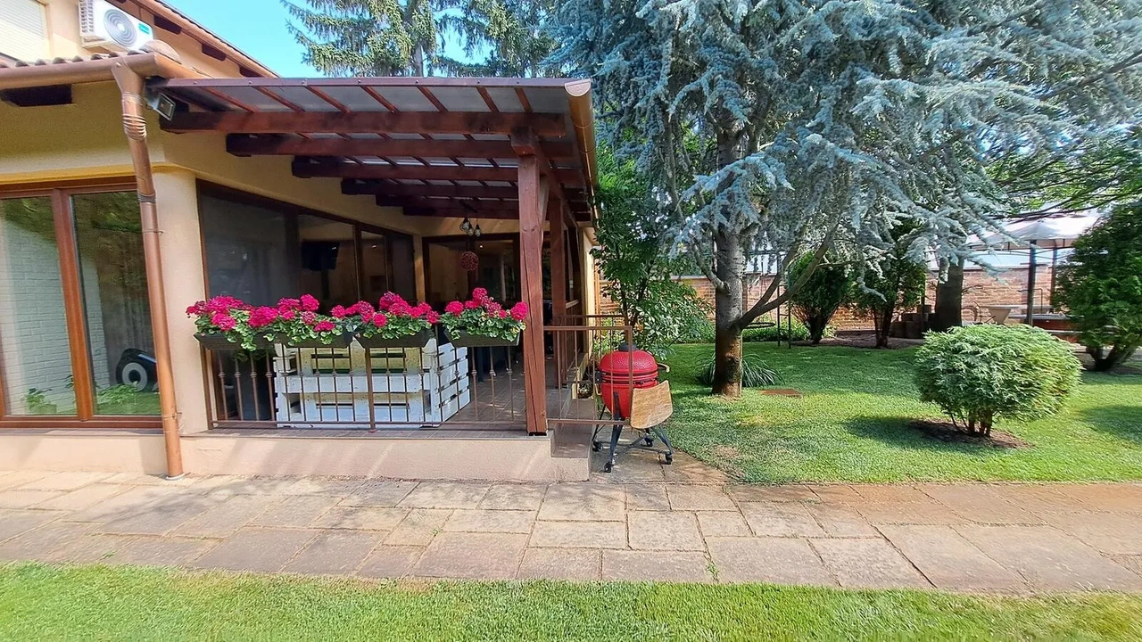 A kert elragadó, árnyékos helyekkel, szépen nyírt gyeppel, automata öntözéssel, kerti sütögetővel, télikerttel és wellness részleggel - ide tartozik a jakuzzi, a szauna. A garázsban két autó is elfér. A ház energiatakarékos működésű, kiváló állapotú bútorai pedig az ár részét képezik.