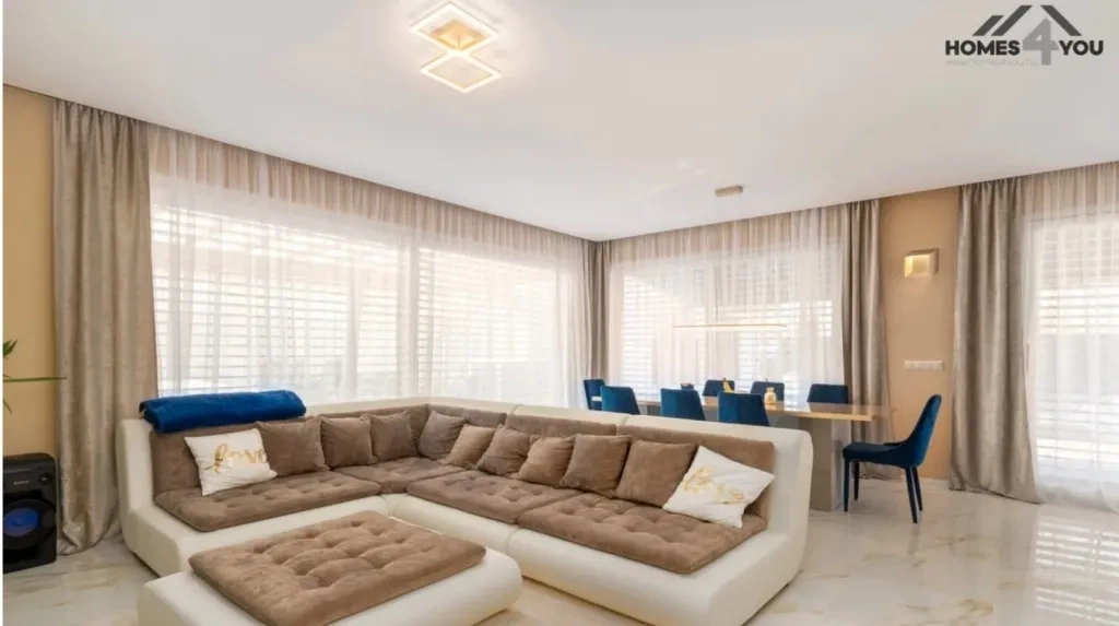 A térfelosztás családbarát: amerikai konyhás nappali, négy hálószoba, két fürdő, valamint mosókonyha, gardrób és garázs alkotja a lakóteret. A kivitelezéshez nem tartozó munkákról (terasz, autóbeálló, kerítés, kertépítés, meglévő épület bontása, stb) egyedileg kell egyeztetned az építtetővel.