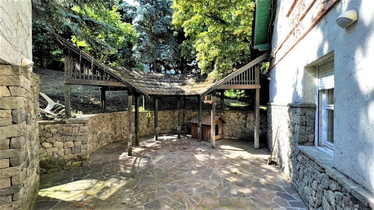 Szinte arisztokratikus érzés, amikor az elektromos kapu feltárul, és nem egyből a garázsajtóval találod szembe magad, hanem egy kanyargós, aszfaltozott magánúttal. Ilyen jelenetekkel általában filmekben lehet találkozni, amelyben a főhős lassan hajt fel a birtokára, miközben a fák suhannak el mellette. A hétköznapi valóságban ritkán adatik meg ez a fajta elegáns megérkezés, de itt, Leányfalu hegyoldalában, ezen a 3036 négyzetméteres telken ez a napi rutin része.
