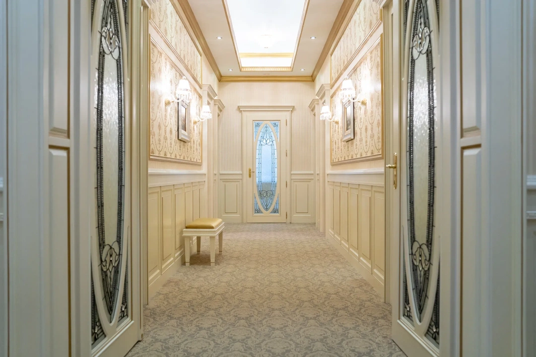 A házban minden részlet klasszikus eleganciát sugároz: a fa kazettás falak, az arany díszítőelemek, stukkók és díszlécek – mintha csak egy arisztokrata lakosztályába csöppentél volna.