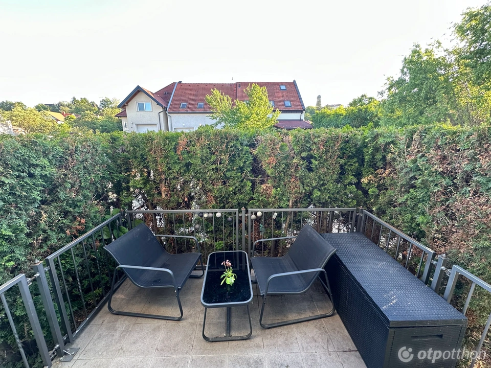 A földszinti lakáshoz tartozik egy mini terasz, amit sűrű sövény választ el a járdától. Intimnek éppen nem mondható, de azért meglehetősen diszkrét. Az ingatlan nem okosotthon, de vannak okos megoldások: ilyen a távolról vezérelhető termosztát és a légkondi.