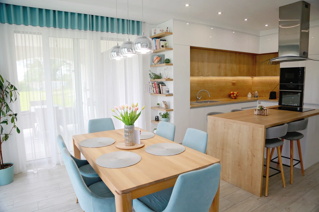A kék szín ellenére is melegség árad ebből a nappali-étkezőből