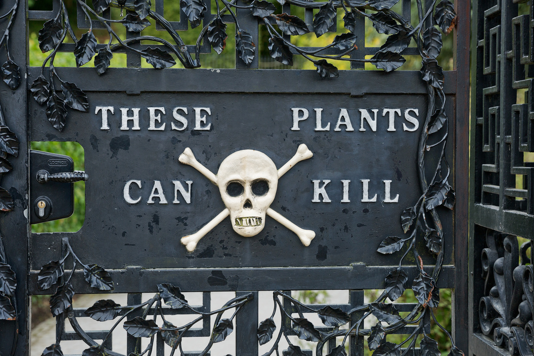 Fekete kovácsoltvas borostyánlevelek ölelik körbe a fehér halálfejes kaput. Ez a figyelemfelkeltés nemcsak turistalátványosság, hanem az észak-angliai Alnwick Garden méregkertje, ami 100 különféle mérgező növényt mutat be. Sajnos ezek közül gyakoriak az elhagyatott mezőn termő, jellegtelen növények is, amik könnyen összetéveszthetők más, kíméletesebb fajtákkal. Olyat is találtunk, ami a magyar kertek nagy kedvence.