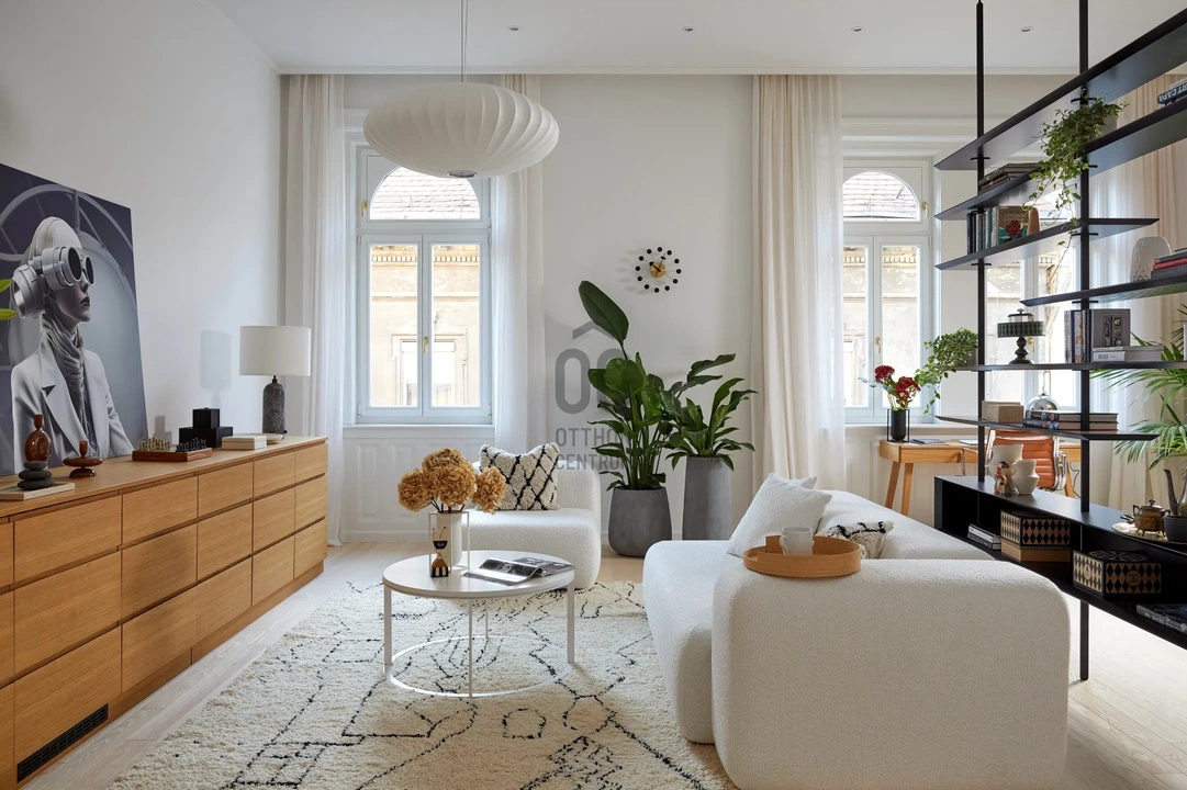 A modern eklektika lehetővé teszi hogy a káoszból harmóniát teremtsünk. Megteremthetjük az anyagok, formák, stílusok és színek végtelen lehetőségéből a tökéletes alkotást. A különböző stílusú bútorok összhangban vannak a modernebb ülőgarnitúrával. Ennek az V. kerületben található lakásnak a kivitelezéséről kifinomult ízlésvilág árulkodik.