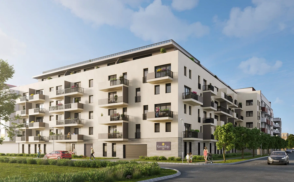 Ugyancsak a Reitter Ferenc utca vonalán, a Zsinór utca találkozásánál valósul meg a GreenTop lakópark. A 79 korszerű, 1-5 szobás otthont rejtő fejlesztés nemcsak elegáns kialakításával, de exkluzív, közösségi tetőkertjével is igyekszik kiemelkedni a szomszédos épületek közül, ötvözve a modern esztétikát, a fenntarthatóságot és a komfortos életkörnyezetet. A szintén ötemeletes GreenTop homlokzata változatos textúrák és színek harmonikus kombinációjával készül, amely időtálló megjelenéssel párosul. A kőburkolat és a fekete fém elemek adják az épület kontrasztját, míg a nagy üvegfelületek a természetes fény beáramlását segítik elő, fokozva a belső terek világosságát és nyitottságát.