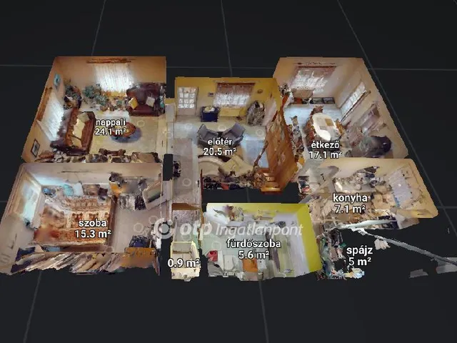 Az 1997-ban B30-as Porotherm téglából épült ingatlan egy 1526 nm-es telken helyezkedik el. Az ingatlan félig alápincézett, ahol a kazánház és egy zöldséges pince is helyet kapott. Az élület földszintjén található egy teljes értékű szoba, egy nagy nappali, társalgó, konyha + étkező + spájz, valamint fürdőszoba külön wc-vel. A lakóteret 2 külön bejáraton-, és a pincén keresztül is megközelíthető. Ezen a szinten az étkezőből nyílik egy nagy tágas terasz, amely rengeteg lehetőséget rejt magában.
