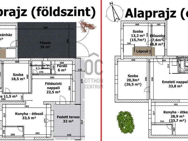 Két, nem átjárható lakórész van kialakítva az épületben, az egyik a földszinten (116 nm + terasz, + garázs), a másik az emeleten (123 nm + erkély)