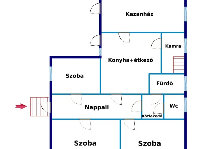 A helyiségek tekintetében kialakításra került 3 szoba , konyha,kamra, nappali, fürdő, és külön WC.