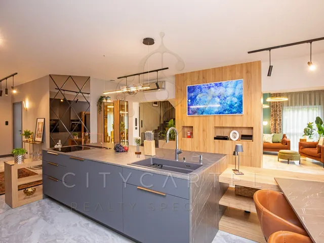 - Tágas amerikai konyhás nappali, 3 hálószoba, 3 fürdőszoba, gépház, padlástér, mosókonyha, bortrezor.