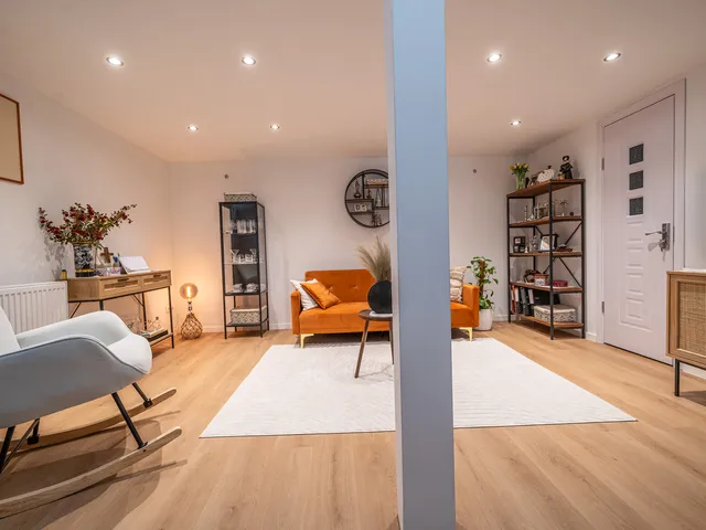 A tulajdonos a ritka nagy belmagasságot (4,2 méter) kiválóan kihasználta, hiszen kialakított belső két szintet így a lenti részen helyet kapott az élettér: előtér-konyha-étkező, nappali, fürdőszoba-wc-vel, a fenti szinten pedig helyet kapott a hálótér, egy gardrób helyiséggel és egy külön wc-vel is.